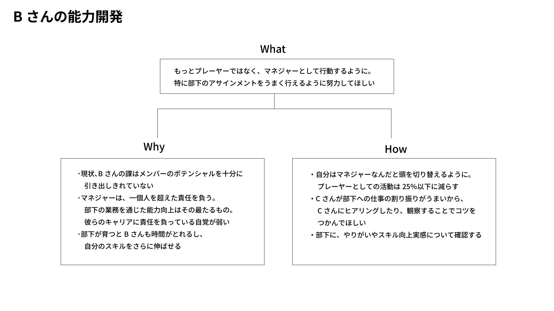 Bさんに即座に聞いてもらえそうなのが今回挙げた3つだったと考えてください。必要に応じて、能力開発はさらにブレークダウンして「ロールモデルの活用」「体系的なマネジメントスキルの学習」としてもいいでしょう。
