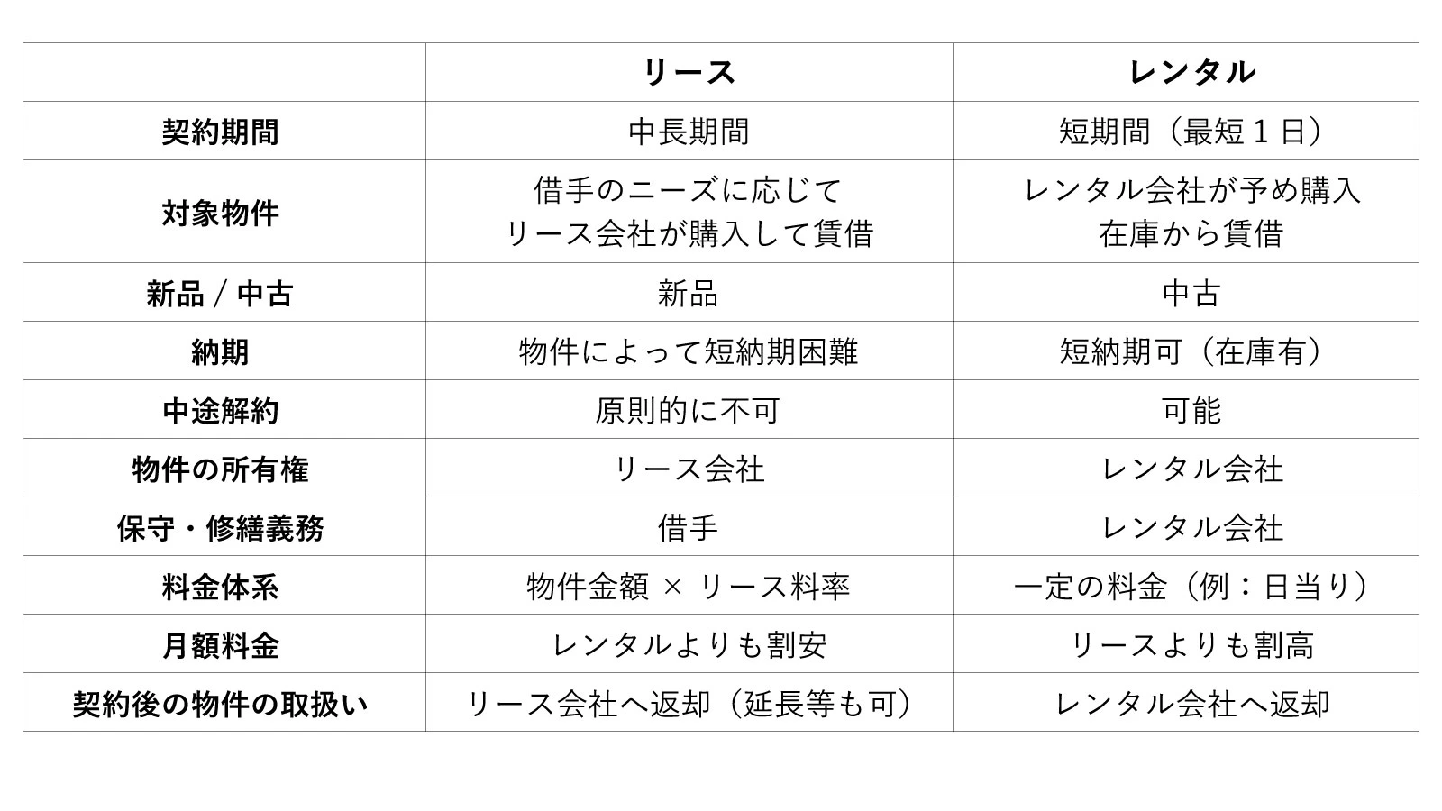 レンタルは、ザックリその反対となります。つまり、リースと比べると必要な時だけ短期間で物件を賃借することができます。短期間のため保守・修繕義務は通常は発生しません。また、事務処理負担の軽減も魅力です。一方、借手の自由度が高い分、料金が割高となる、物件が中古で選択肢が少ないといったデメリットがあります。