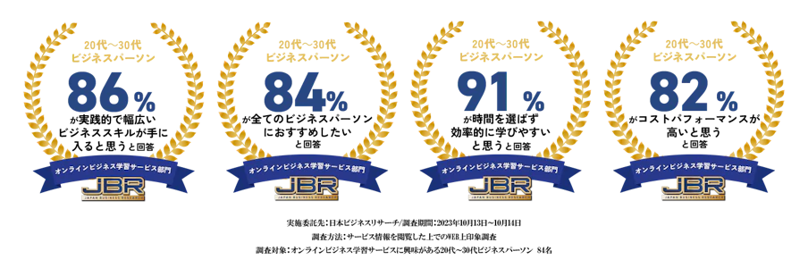 - 20代〜30代ビジネスパーソン334名を対象とした調査の結果、オンラインビジネス学習サービス部門、4部門で高評価を達成!