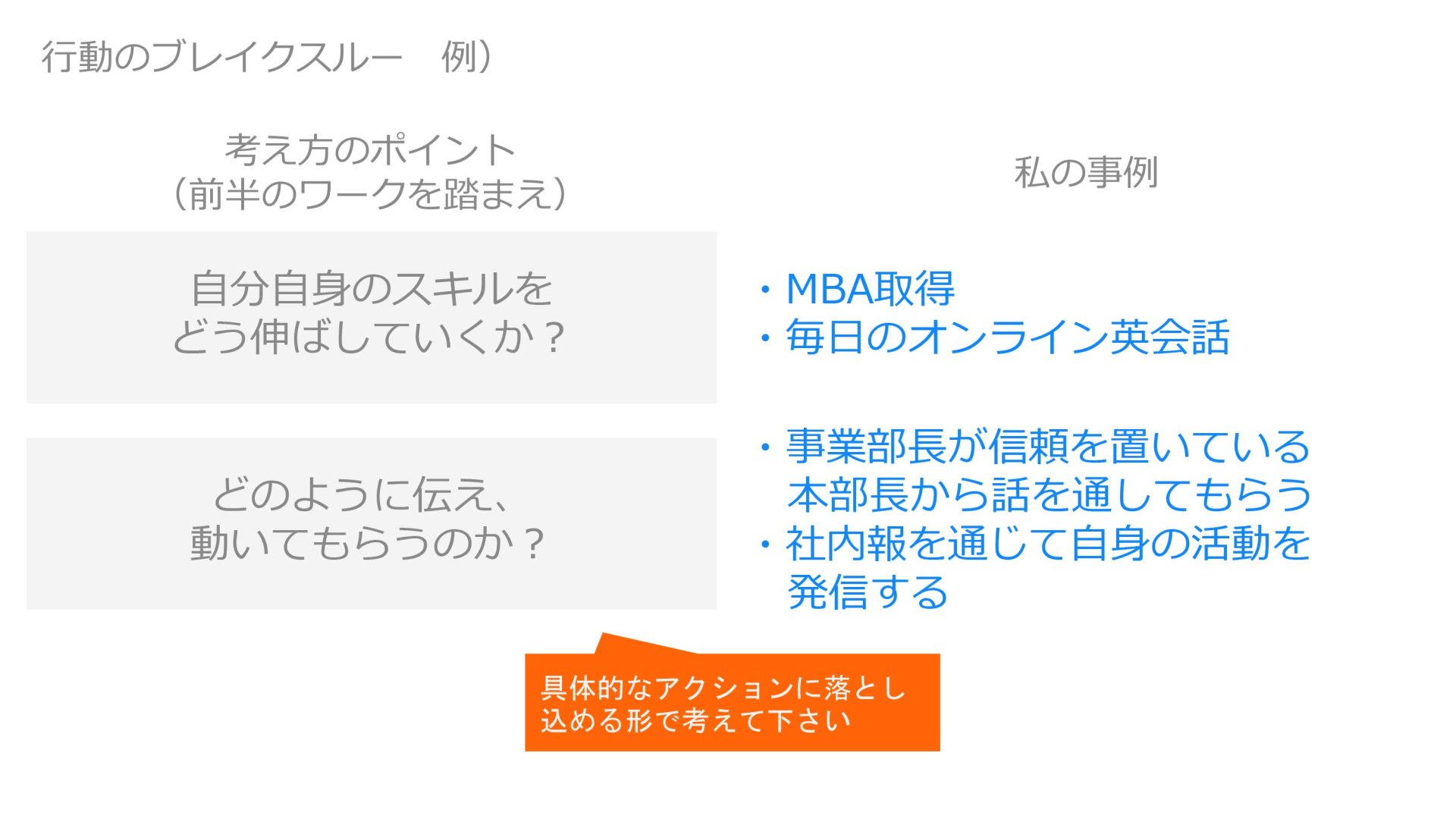 後半は行動のブレイクスルーについてお伝えします。前半は、マーケティング戦略を自身のキャリアに応用した場合に何を考えればよいのか、思考のブレイクスルーをしました。この後は必然的に実行になります。