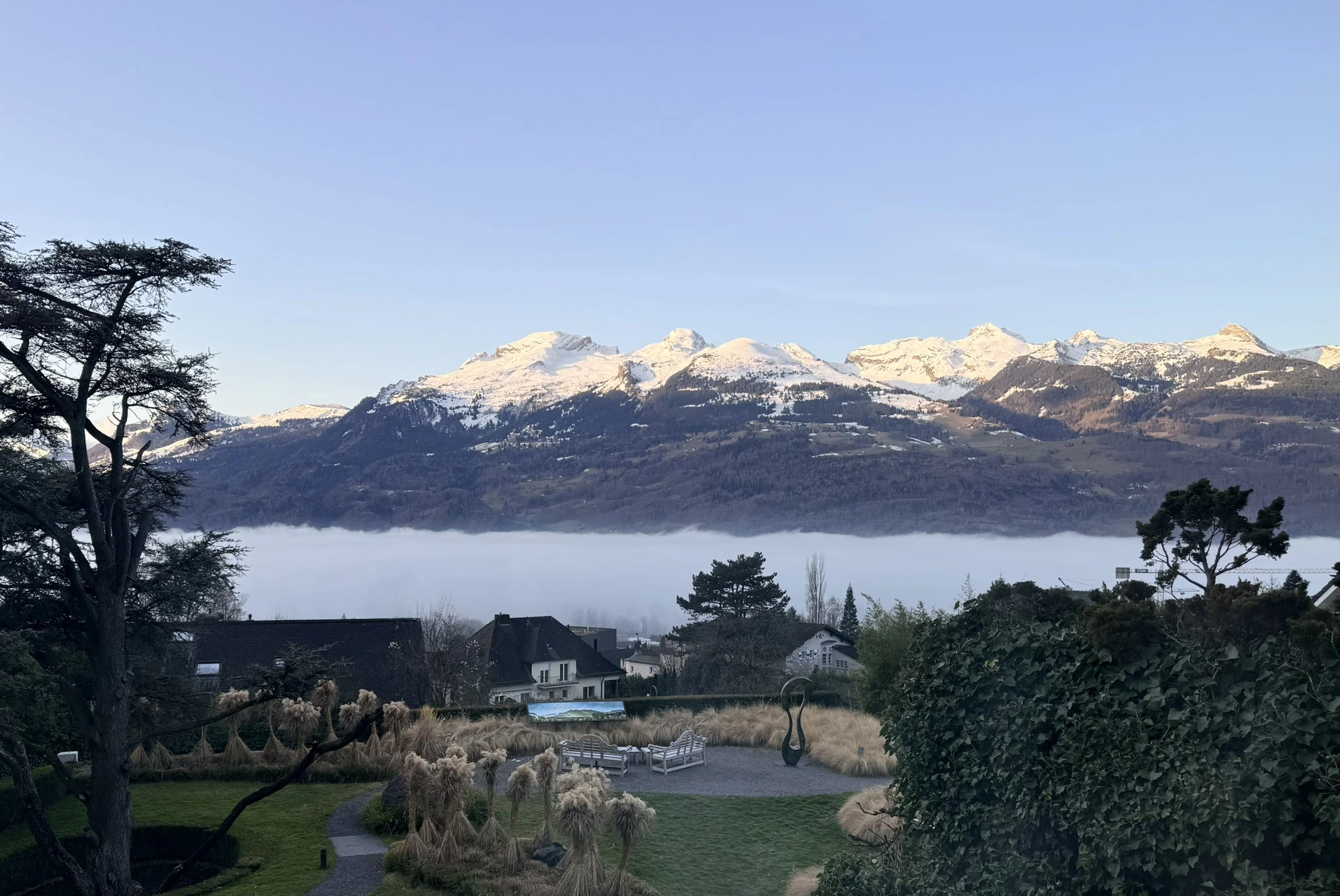ダボス会議初日。リヒテンシュタインのホテルのレストランから見える景色は息を呑むほど美しい。アルプスの渓谷に雲海が広がる。