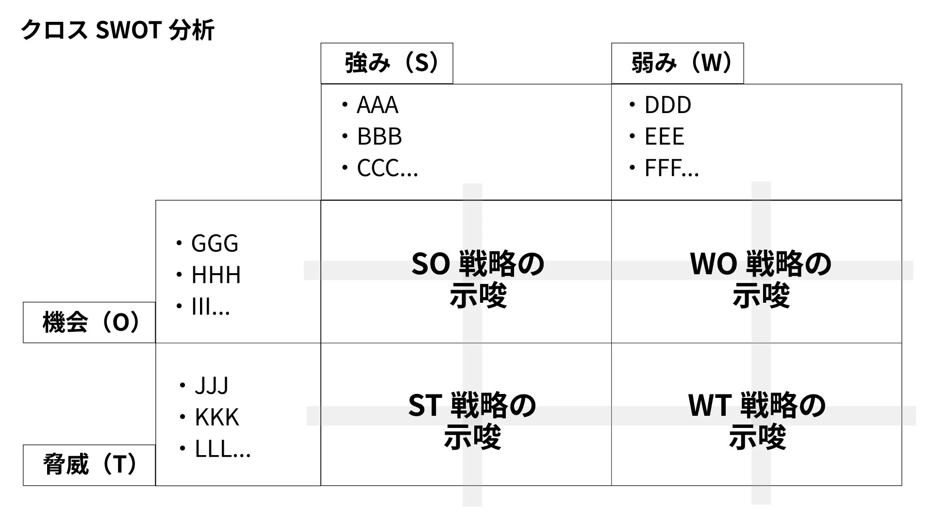 クロスSWOTでは、図表に示したように、4つのセルごとにどのような示唆が得られるかを検討します。