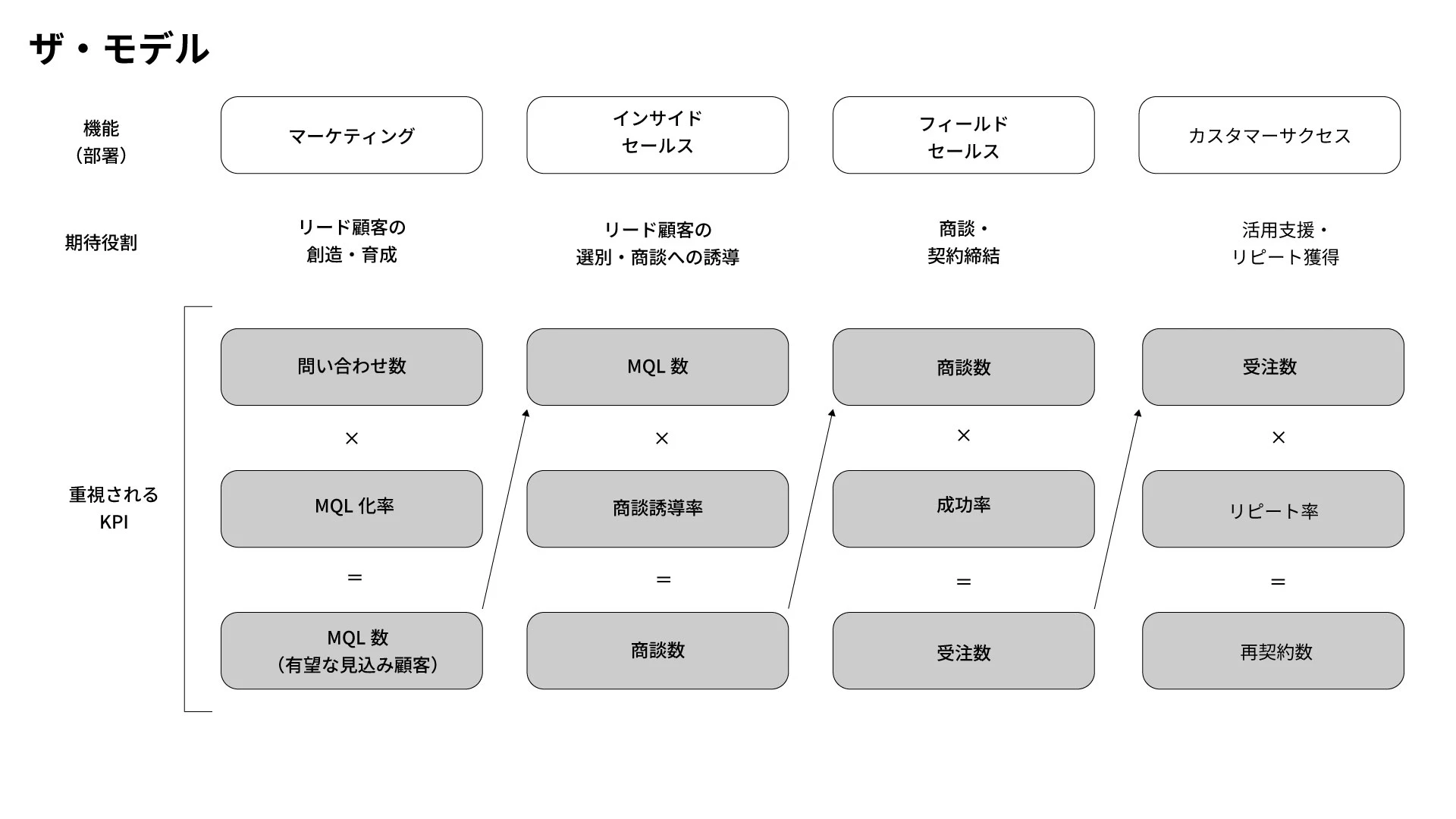 セールスフォースが提唱する、営業活動における分業体制「ザ・モデル」は、「マーケティング」「インサイドセールス」「フィールドセールス」「カスタマーサクセス」の4つのプロセスから成ります。