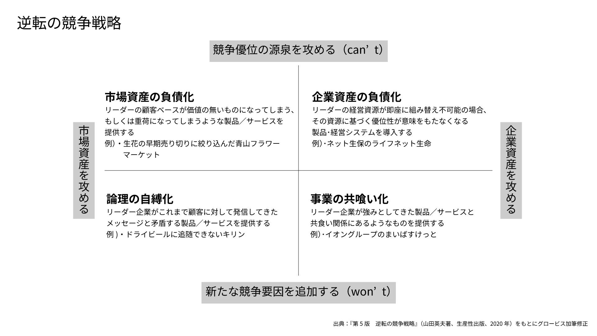 この方法論について体系化したのが、山田英夫教授による「逆転の競争戦略のマトリクス」です。図表に示した縱軸と横軸をとることで、4つの方向性を提示します。